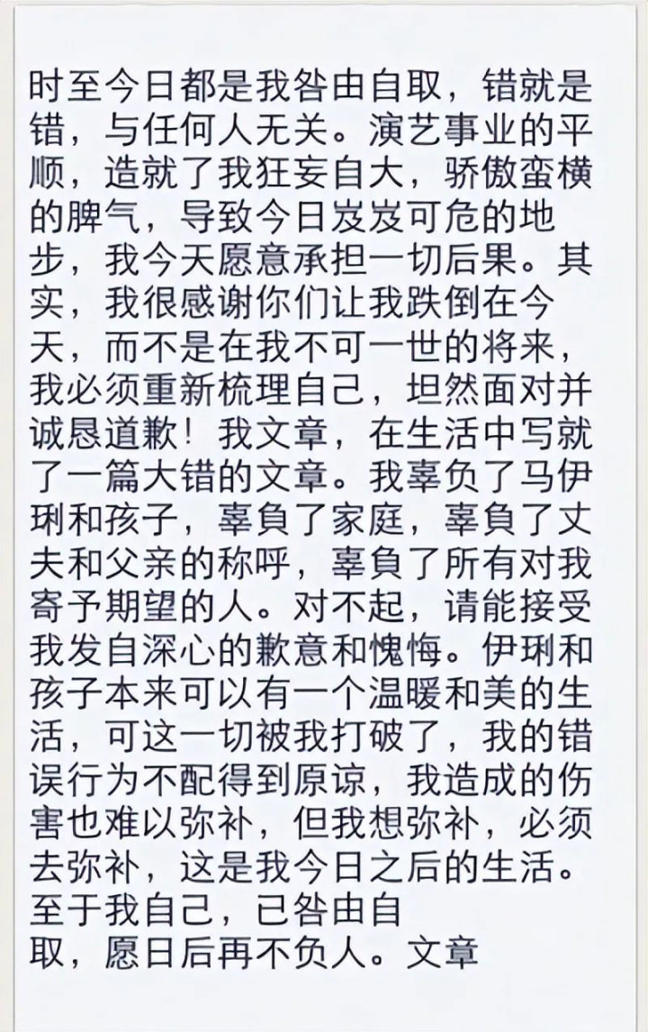 出轨姚笛被公开后,文章很快就发布了一篇长文悔过,并表示要弥补马利伊和孩子。
